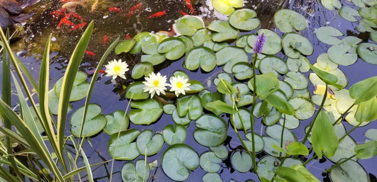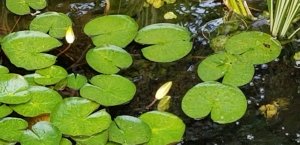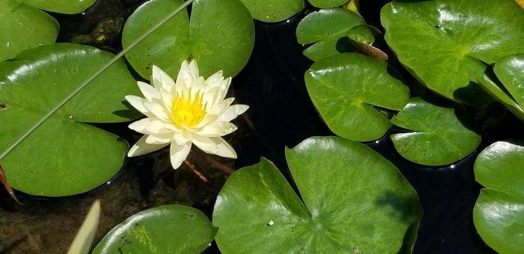 The round green lily pad leaves begin to push up and unfurl from the depths of water in the spring. Beginning to cover the top of my pond, they will help to hide the 30 fish from the great blue heron’s keen eyes. The surface water had frozen over during winter’s cold, the fish in torpor mode below. Apparently, the plants survive the chill, and strive to survive, too. In July, the lily pads unfold and lie gently atop the water, covering the pond’s surface.