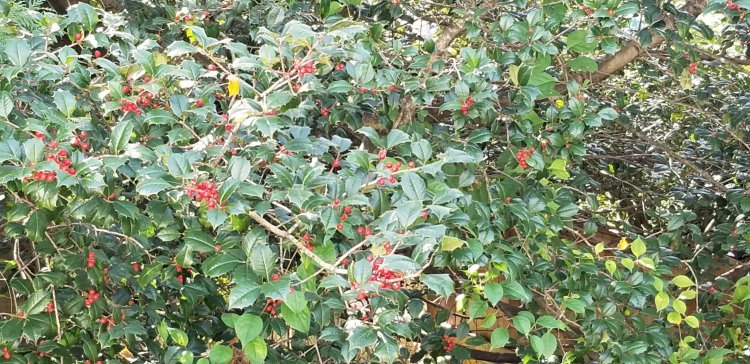 Holly trees, pushing red berries, beckon squirrels to breakfast.