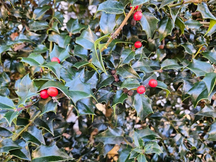 As I turn to the holly tree nearby,