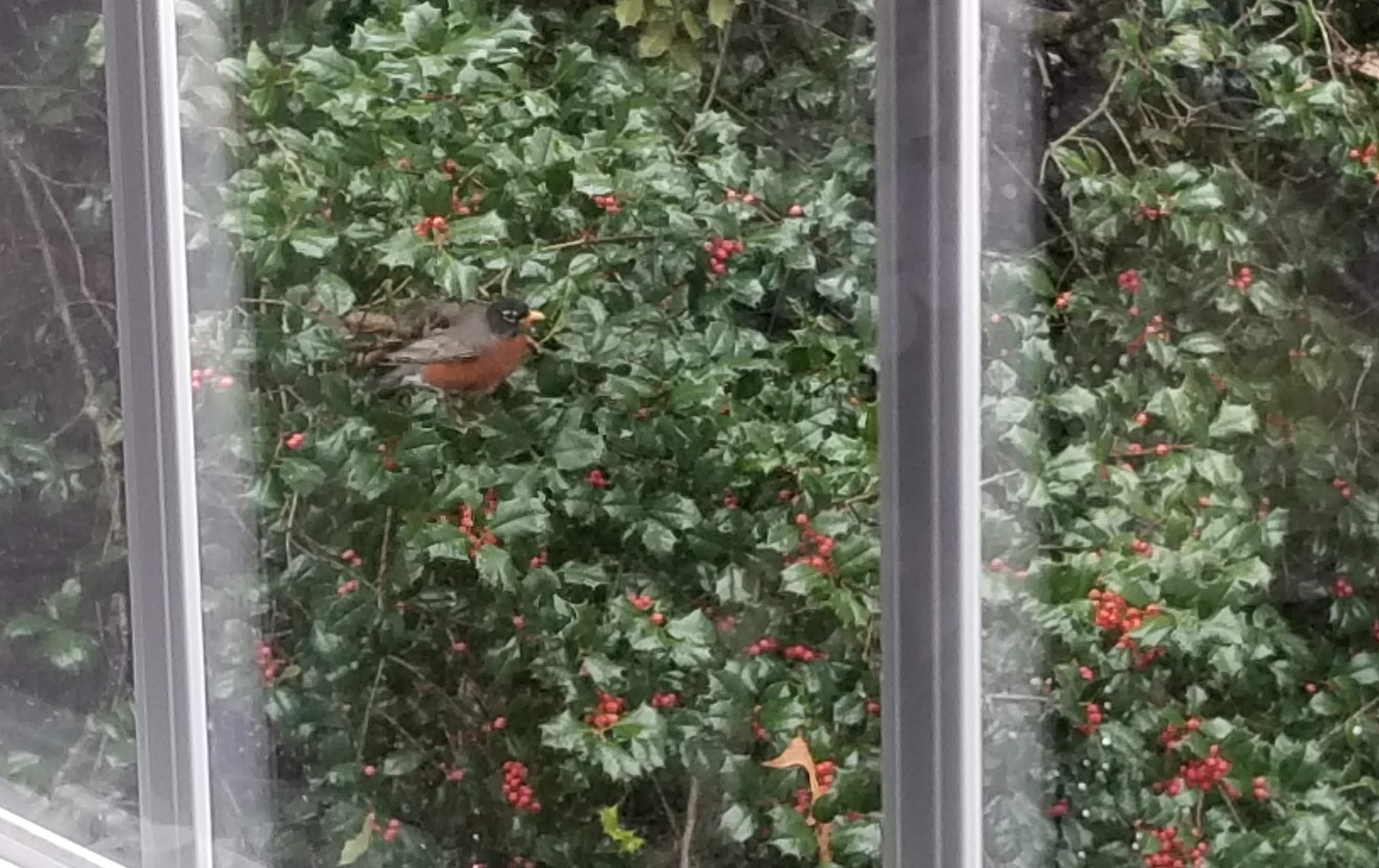 As I gaze out the window, winged life streaks by. Was that a robin?? In January?? Then, something flies by so quickly, but my trained eye notes something blue. I get up to look. Dozens of robins are peeking from among the holly tree’s red berries, which I was sure would have been eaten by now. Sure enough, a blue jay sits atop a neighboring tree branch.